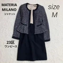 23区のワンピースのフォーマルセットアップです。ノーカラーのジャケットが、首元を綺麗に魅せてくれます。