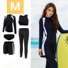 レディースL水着5点セットラッシュガード長袖フィットネスレギンス 黒白体型カバー