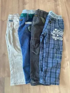 7裏起毛パンツ4点…モカ色花柄パンツ100㎝、ユニクロいないいないばあパンツ100㎝、黒パンツ100㎝、ユニクロガラピコプーパンツ90㎝