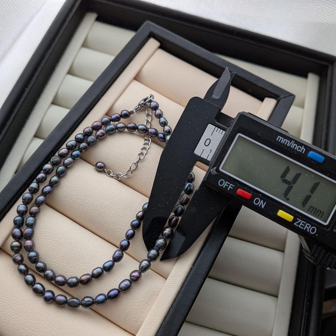 パール直径約4-3.5mm前後、金具含めて約40+5センチです。アレルギーしにくいステンレス金具です。