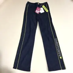 ハートの刺繍とロゴが特徴的なダークブルーのパンツ。