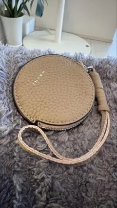 グレーのレザー製、円形ファスナーコインケース。