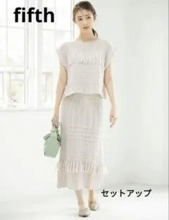 アクリル100%のブルーのカーディガンとスカートのセットアップ。
