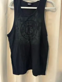 ブラックのロゴ入りタンクトップで、シンプルなバックスタイルが特徴。