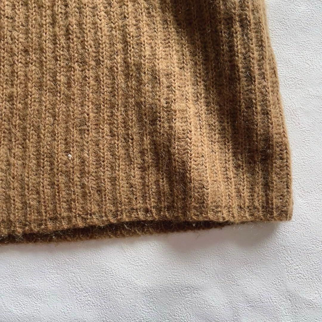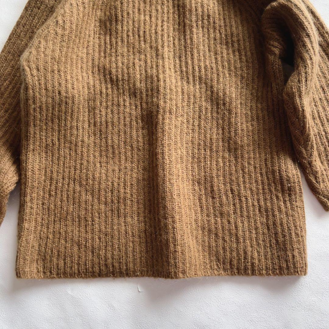 リブ編みのブラウンの少し肉厚なタートルネックセーター、オーバーサイズデザインで快適な着心地。