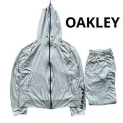 フード付きのグレーのジャージ上下セットで、ジッパーポケット付き。