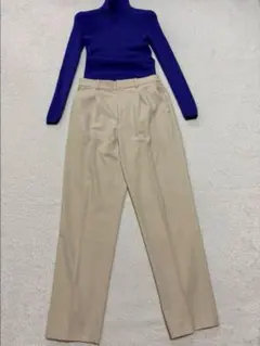 水色のスリット入りセットアップ、ワイドパンツスタイル。
