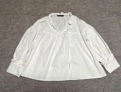 ホワイトとベージュの水玉模様の長袖シャツ、滑らかな生地でゆったりとしたシルエットが特徴。