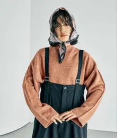 ★オーバーサイズのグレー系タートルネックニット。リブ編みの袖で、快適な着心地を提供。
