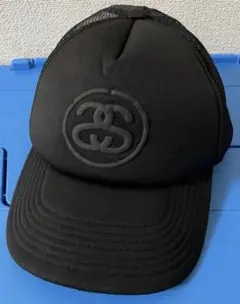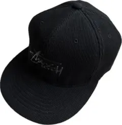 ネイビーのSTUSSY刺繍ロゴ6パネルのベースボールキャップです。