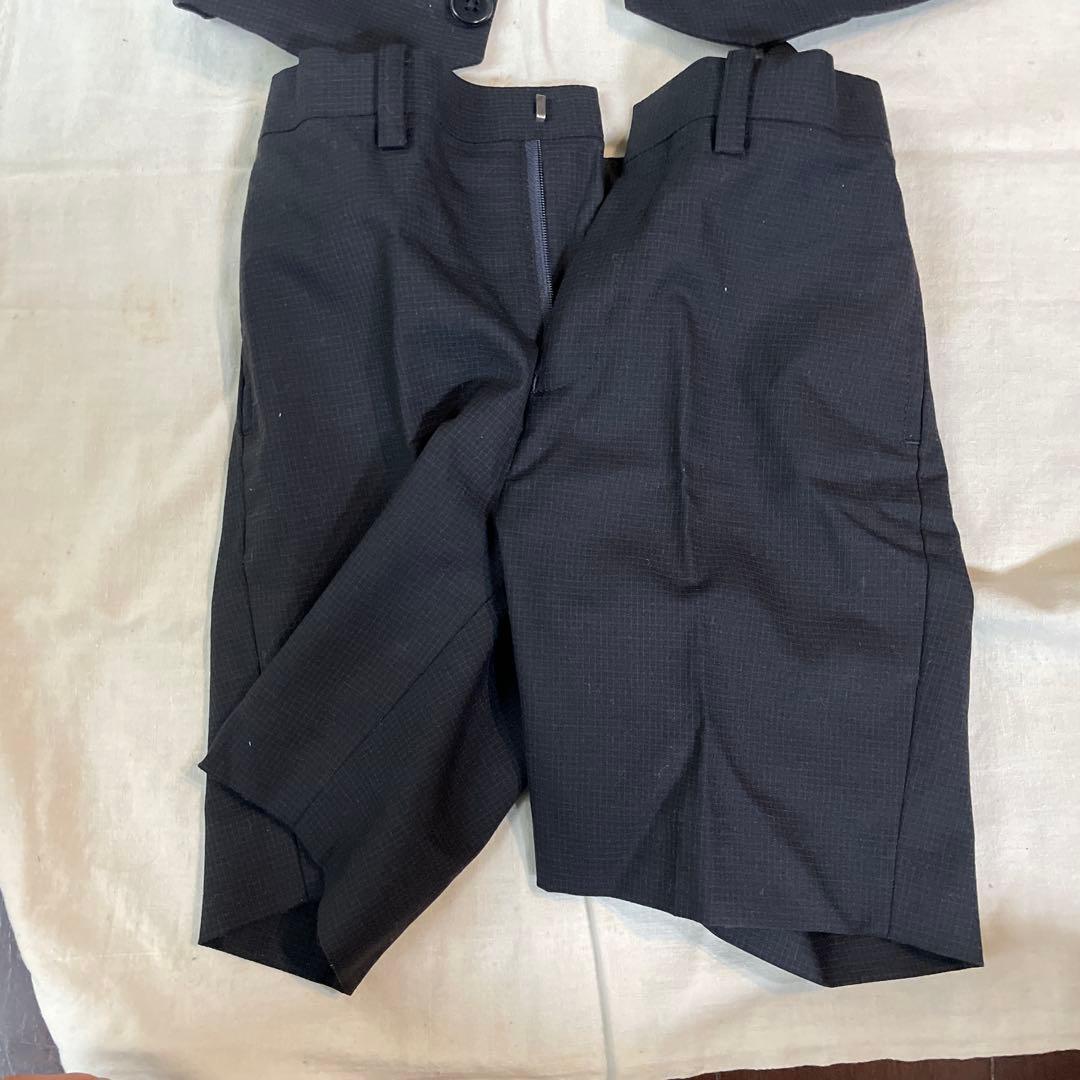 ダークネイビーのタキシードセット、ベストとショートパンツの組み合わせ。