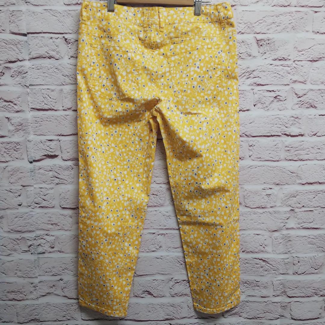 黄色とオレンジの中間のような、山吹色が鮮やかな花柄のストレートパンツです。