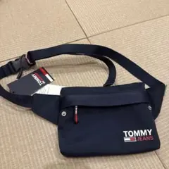 調整可能なストラップとファスナー付きポケットを備えたコンパクトなブラックボディバッグ。