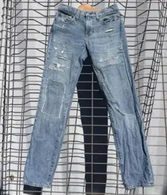 リラックスフィットのライトブルーデニム、ダメージ加工が特徴。
