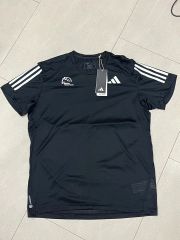 ダークグレーのadidasロゴTシャツ、カジュアルスタイルに最適。