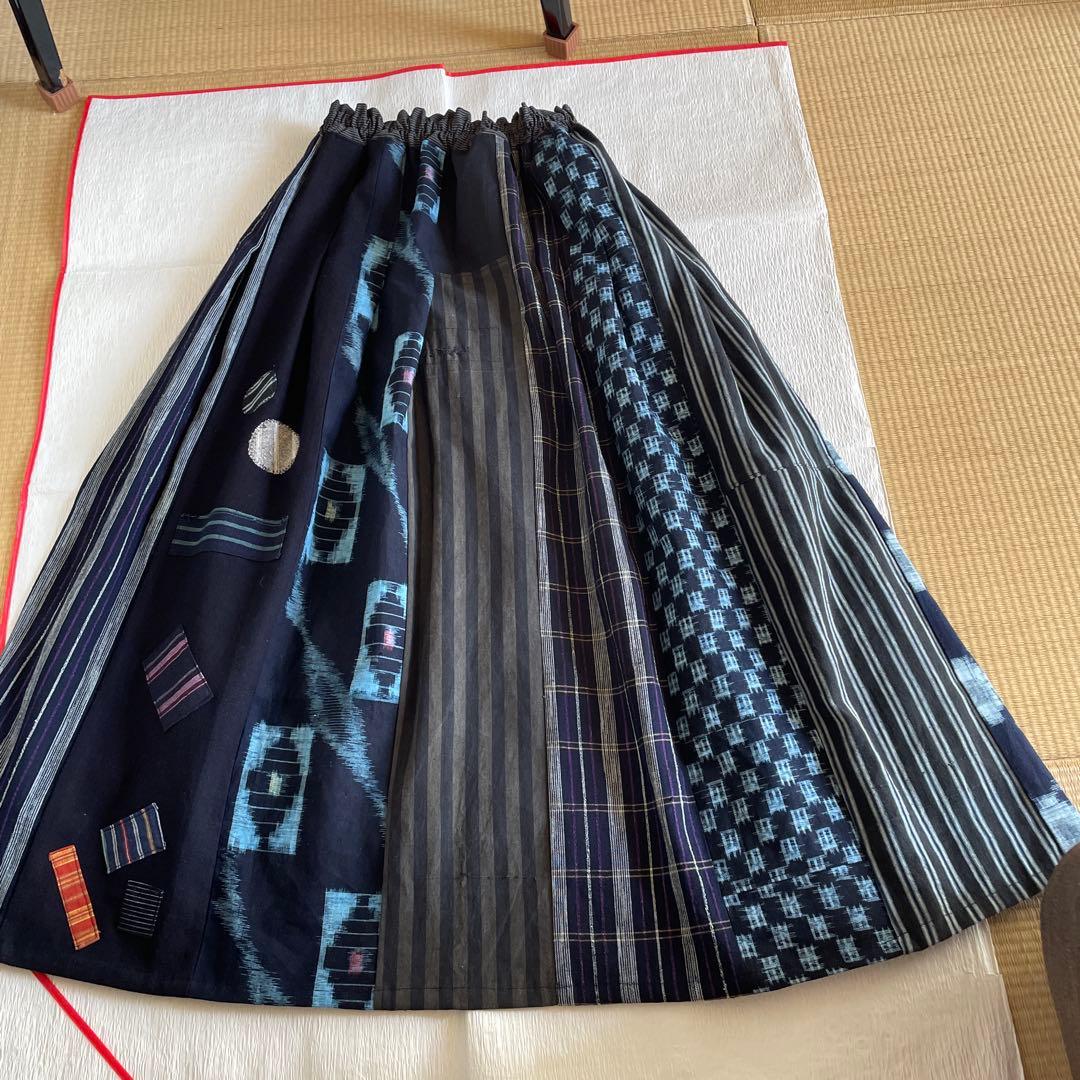 色々な古布のかすりの着物・縞木綿、藍染の半纏からロングのギャザースカートを作りました。