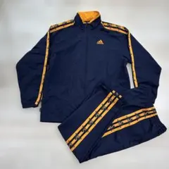 Climalite素材を使用したネイビーのadidasジャージ、イエローのストライプが特徴。