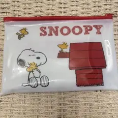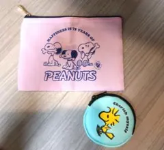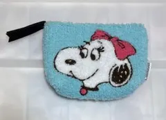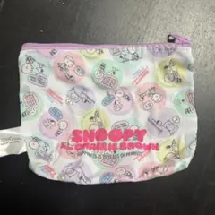 スヌーピーのキャラクターが描かれたクリーム色のポーチ。