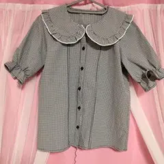 フリルと十字架刺繍が特徴の黒い半袖ブラウス。