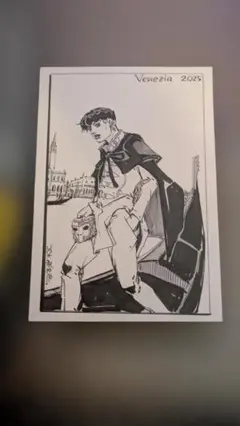 ヴェネツィアの風景を背景にしたモノクロイラストの岸辺露伴のポストカードです!