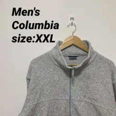 ネイビーのColumbiaフリースジャケット、ハイネックデザインとジッパーポケット付き。