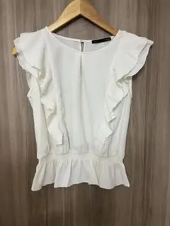 フリルデザインのホワイトシフォンノースリーブシャツ。