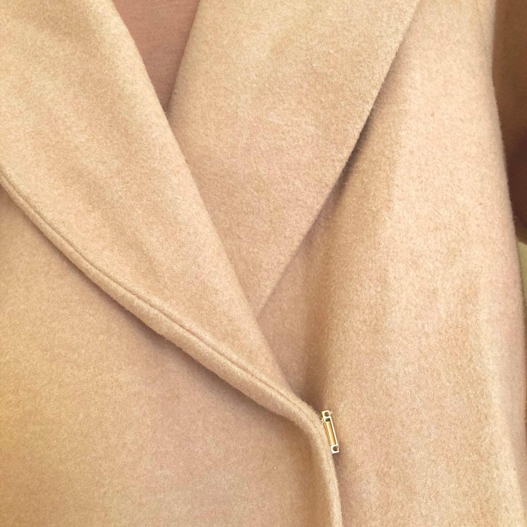 ピンクベージュのオープンフロントロングコート、ラペルカラーが特徴。