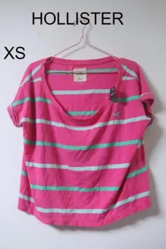 ネイビーのHollister製VネックTシャツ、ピンクの文字プリント付き。