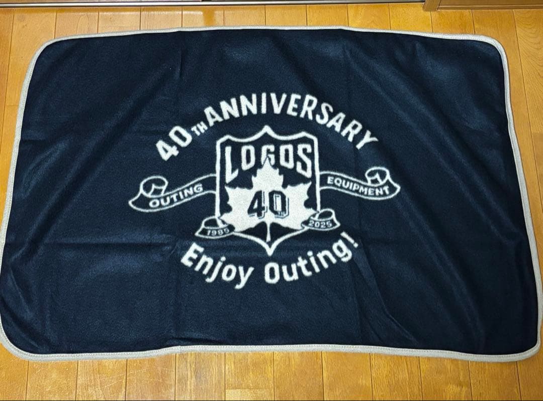 40周年記念のLOGOS製ブランケット、黒色で「Enjoy Outing!」のメッセージ付き。