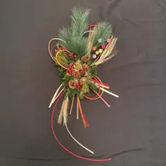 材料はアーティフィシャルフラワーを使用。縁起の良いとされる南天の実・輪が綺麗な大きなダリア、アスカさんの色味が美しいアジサイなどの花材を使い、とても華やかでボリュームあるバランスの良い作品に仕上げました。2色使いの水引と丁寧な作りの水引細工がポイントです。