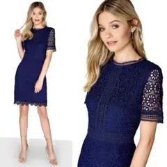 新品タグ付き【UK6】ネイビー レーススリーブペンシルドレス パーティードレス
