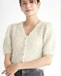ファー付きのホワイト半袖ニットで、カジュアルなスタイルに最適。