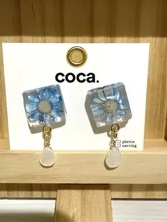 青と緑のレジンで作られたロングピアス、花のデザインが特徴。