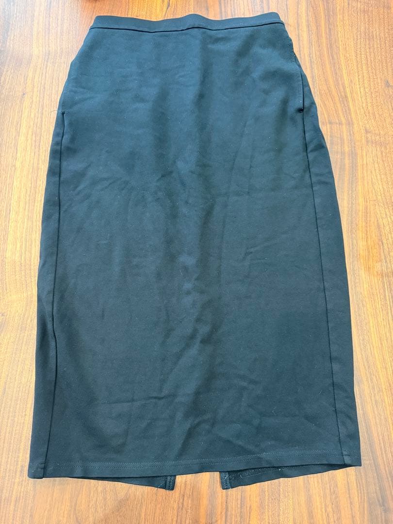 黒のタイトスカート、ゴムウエストと前スリット付き。
