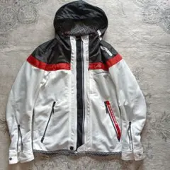 軽量で通気性のあるグレーのジャケット、フード付きでサイドポケットあり。
