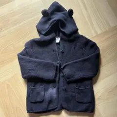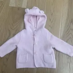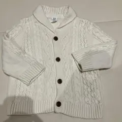 フード付きのホワイトカーディガン、赤ちゃんに最適なデザインです。