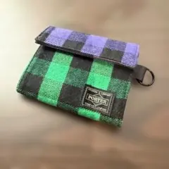 オリーブ色のナイロン製三つ折り財布、PORTERのロゴ付き。