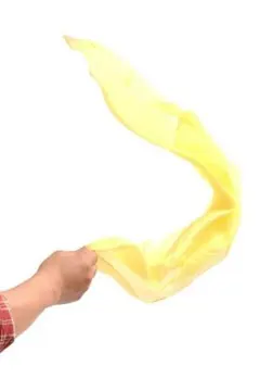 *マジシャンはティッシュペーパーの裏表良く示します。手の中で丸めて空中に投げると黄色の紙テープが広がるのです。