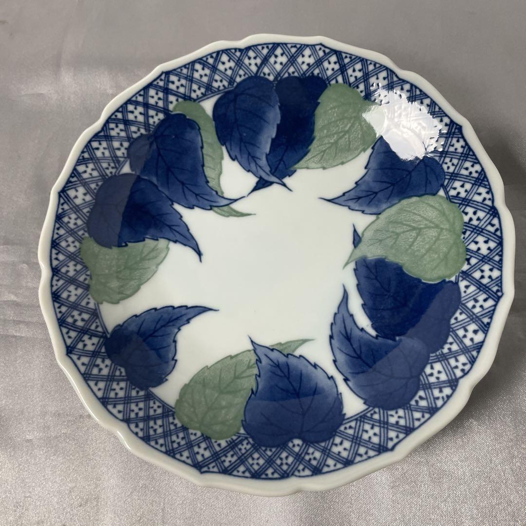 青と緑の葉模様が美しい陶磁器の皿5枚セット。