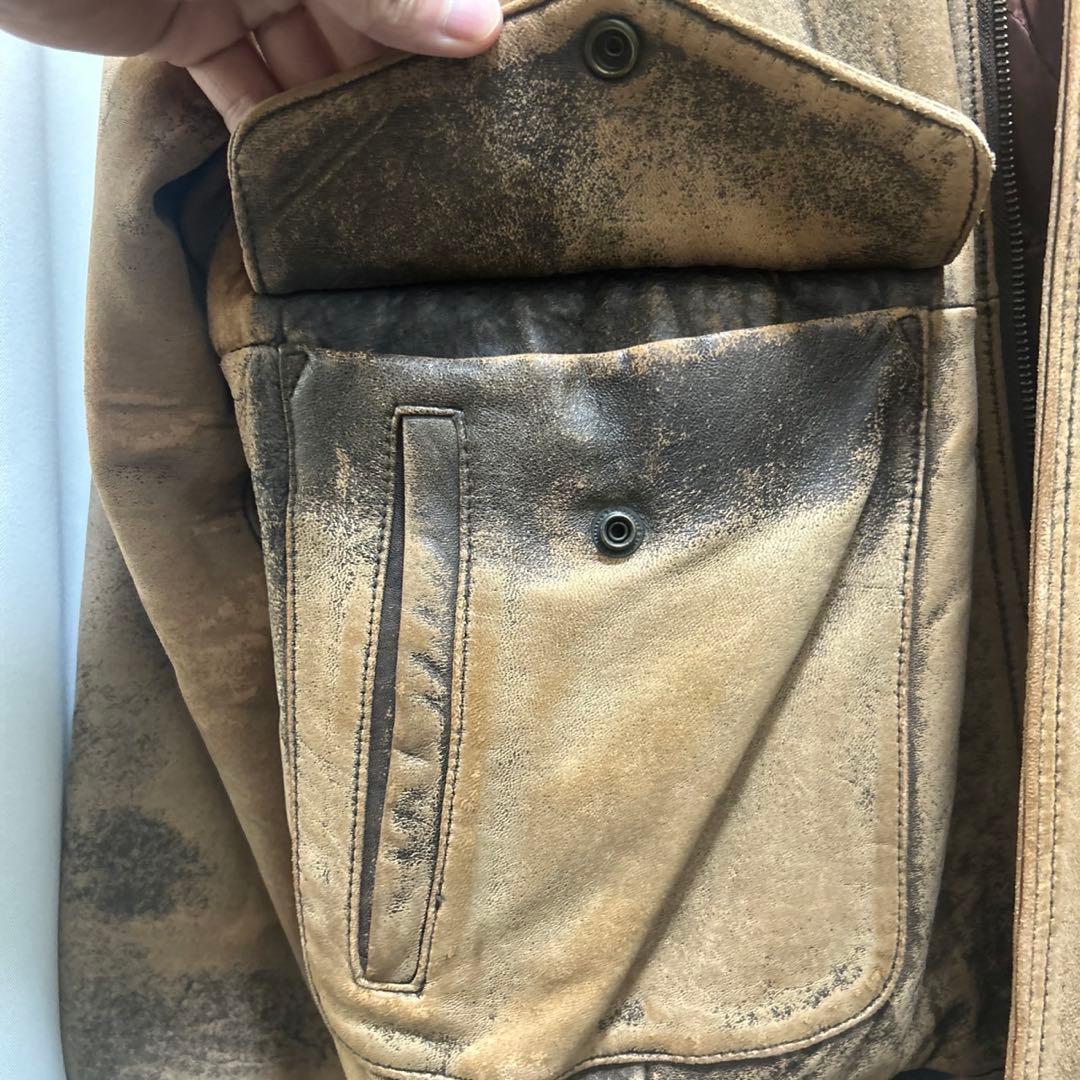 ブラウンのダブルポケット付きレザージャケット、リブ付き裾でスタイリッシュ。