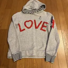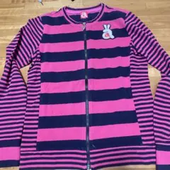 赤と青のストライプが特徴的なフード付きセーター。ジッパー付きで着脱が簡単です。