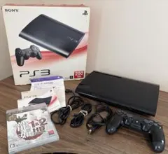 コンパクトなデザインのブラックのPlayStation 3、USB接続端子付き。