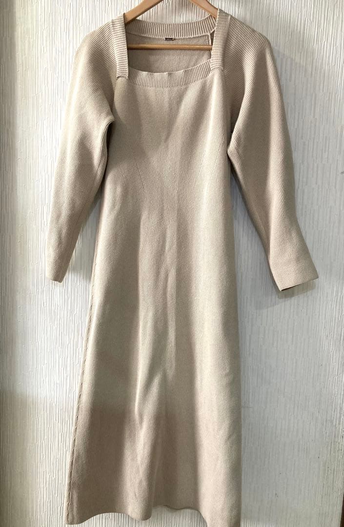 シンプルで洗練されたベージュのロングニットワンピース、長袖デザインでスタイルを引き立てます。