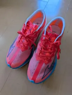 ネイビーとホワイトのMizunoランニングシューズ、ブルーソール付き。