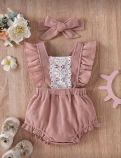 リブ編みデザインのグレーとピンクのボタン式ロンパース、サイズ3-6M。