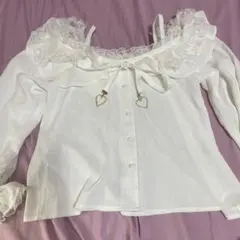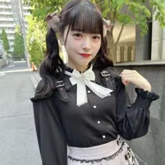 ホワイトとブラックのフリルデザイン、レースディテールの長袖ブラウス。