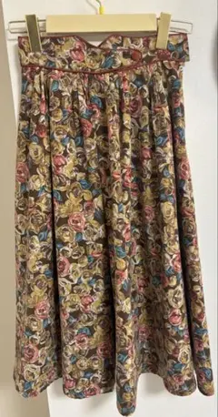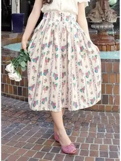 花柄デザインのフレアスカート、ゴールドバックルのベルト付き。