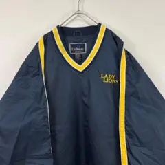 ナイロン素材のネイビーのジップアップジャケット。ラグランスリーブデザインで動きやすさを追求。