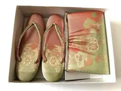 華やかな席に映える、ゴールドに花柄が美しい和装バッグと草履のセットです。