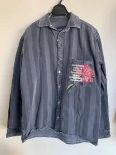 淡いブルーのデニムシャツ、フロントポケット付き、背面にアートプリント。